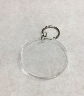 Round shaped clear acrylic key chain.